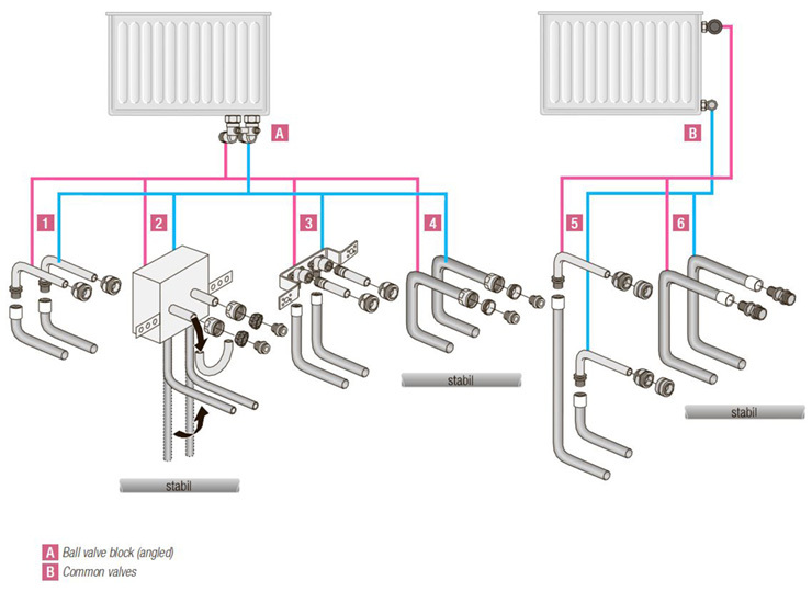 | Connection to valve-regulated radiators | Connection to compact radiators |