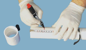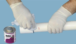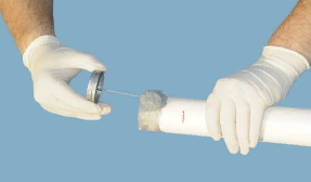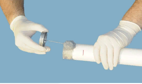 | 7. Клей наносится на трубу ровным слоем. | 8. Клей наносится на внутреннюю часть фитинга тонким ровным слоем. | 9. На поверхность трубы наносится контрольный слой клея. |