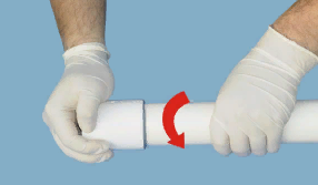 | 10. Фитинг и труба соединяются с нажимом и поворачиванием на 1/4 оборота. | 11. Такое положение удерживается 30 секунд. | 12. Остатки клея удаляются. |