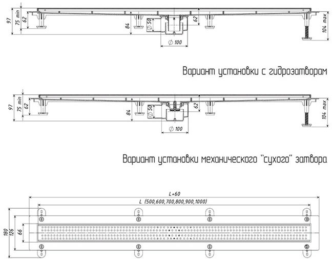 Трап линейный Татполимер без рамки из нерж. стали, решетка В (прямая), сухой мех. и гидро затвор, длина 700 мм, гориз., D - 50 [Артикул: 1d0030 / ТП-55B-700]