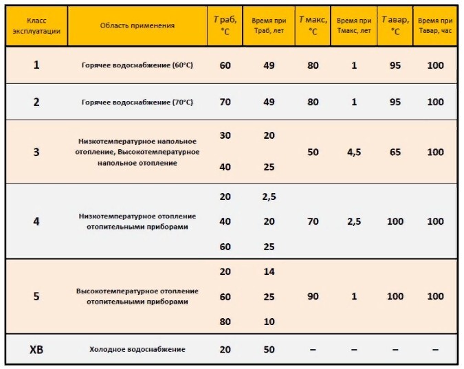 Таблица классов эксплуатации полимерных трубопроводов PEX и PERT